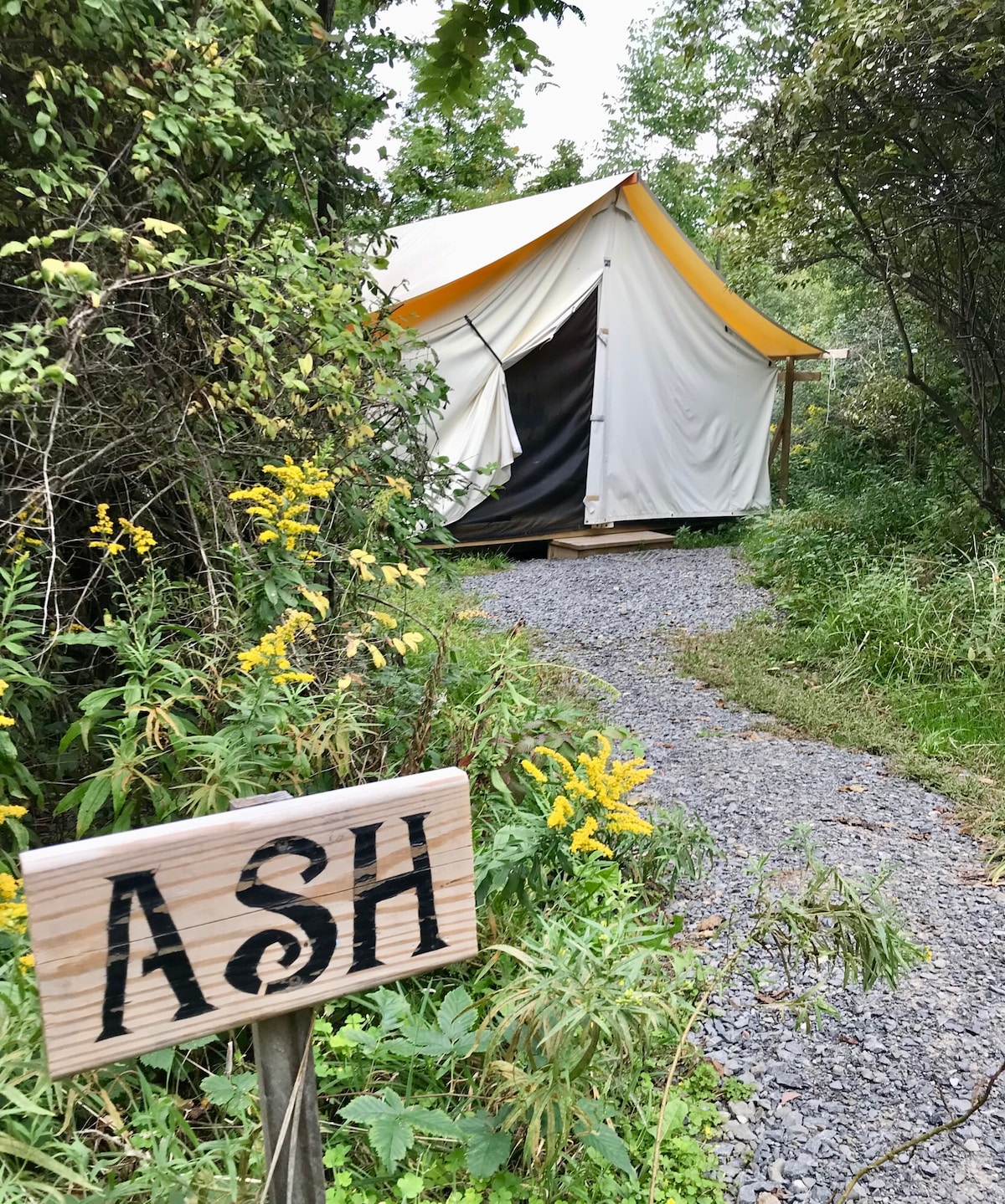 Ash - Custom built safari tent on an elevated wood platform in a secluded forest setting. Within the canvas weather resistant safari tent, amenities include two fully dressed queen beds, comfortable furniture, and a writing desk. Ash has its own covered private back balcony with a wooden bistro set. Your tent is warmly lit with three lanterns and a charging device that will charge most electronic devices.