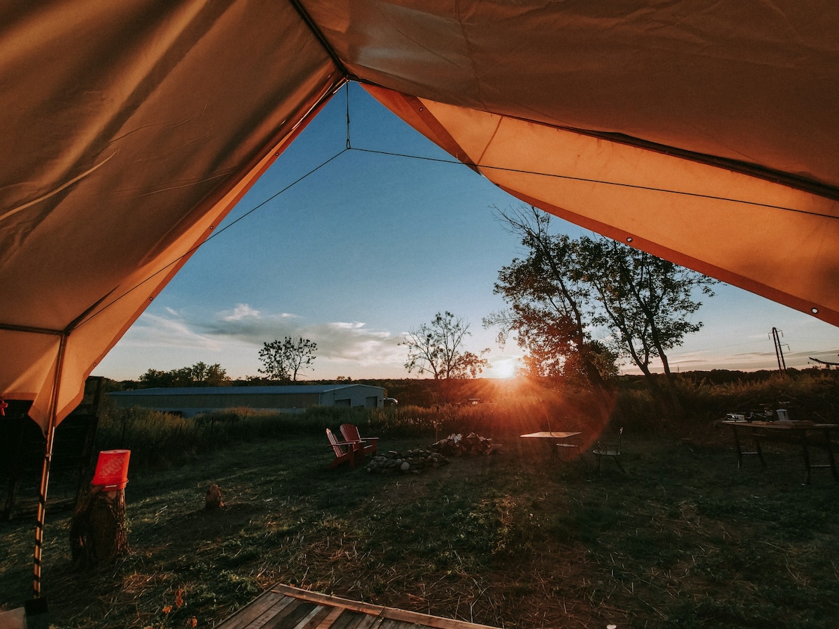 Get away from it all when you stay under the stars. Enjoy a peaceful off-grid stay in this 12 x 24-foot Canvas Tent. The tent has an indoor wood stove, compost toilet, and wash sink. Firewood, potable water, coffee, tea, and hot cereal mix provided. There is also an outdoor picnic area with a fire pit. You can walk, hike, or run trails on our 118 acres of farmland, meadows, and woodland, or just relax, read, meditate, and/or listen to the animals.