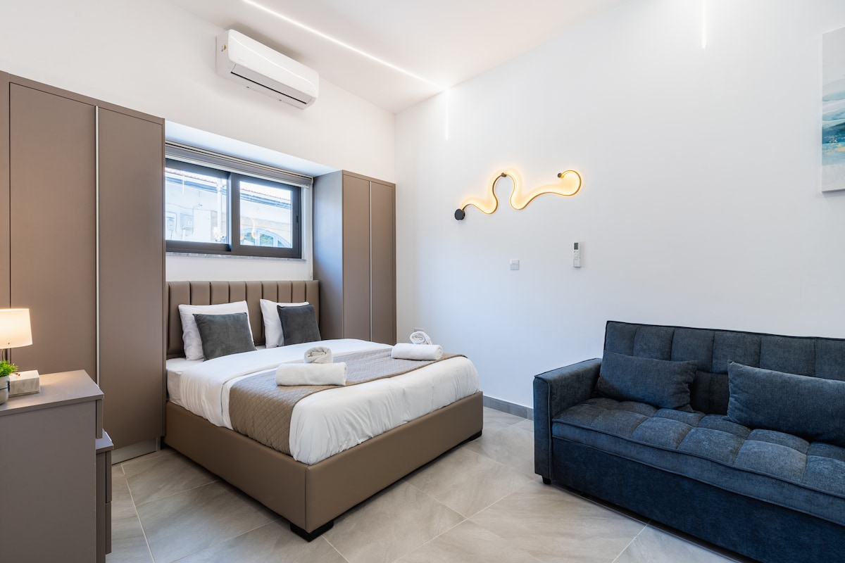 'Le Bandit,' is a cozy and stylish studio designed with comfort and modern aesthetics in mind. Nestled in the vibrant heart of Larnaca’s city center, it offers a perfect blend of convenience, elegance, and urban energy. Please note that due to its central location, guests may experience some noise from nearby clubs and bars, typically until around 01:00 AM — a small trade-off for being steps away from the city’s lively atmosphere.
