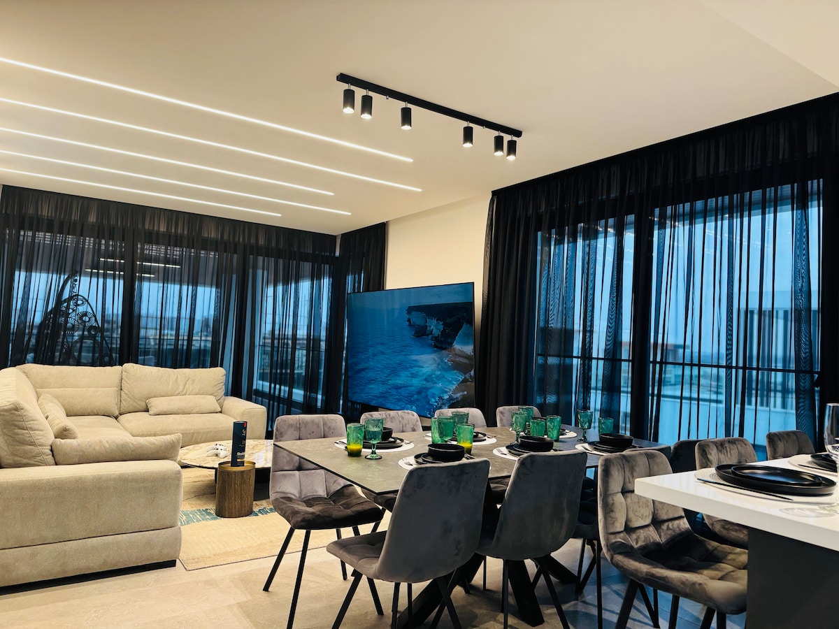 Apartment 404 is a 3 Bedroom top spec & fully equipped beach apartment offering breathtaking views, situated on the most famous beachfront of Larnaca, Finikoudes. It is situated on Tessera Fanaria which is the most luxurious of complex of Larnaca. The bed in 1 room is King Size (180x200cm), in the 2nd room a Queen Size (160x200) and in the 3rd room are two single beds (90x200cm).