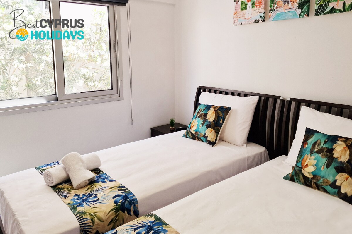 Apartment 404 is a 3 Bedroom top spec & fully equipped beach apartment offering breathtaking views, situated on the most famous beachfront of Larnaca, Finikoudes. It is situated on Tessera Fanaria which is the most luxurious of complex of Larnaca. The bed in 1 room is King Size (180x200cm), in the 2nd room a Queen Size (160x200) and in the 3rd room are two single beds (90x200cm).