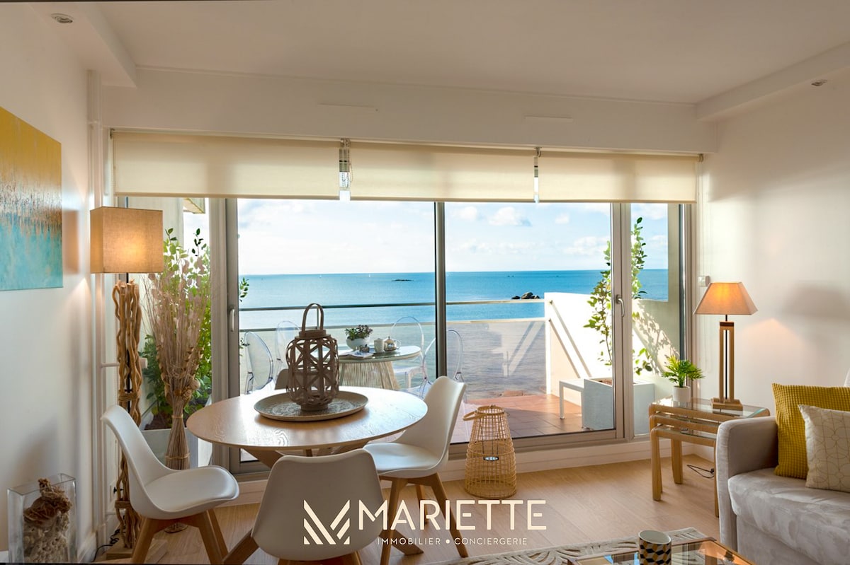 Cette maison d'architecte exceptionnelle a été créée par Erwan Le Berre. La vue est de plus de 180° sur la mer: Est, Sud et Ouest. La piscine d'intérieure est climatisée et agréable. Les pièces à vivre sont sur 2 étages: 1 grand espace salon et salle à manger avec de grandes baies sur la mer et une mezzanine pour la télévision. Pour 6 personnes, elle est constituée de 4 chambres: 2 grandes et 2 petites. Chemin privatif pour accéder à la plage. Classée meublés de tourisme 3 étoiles