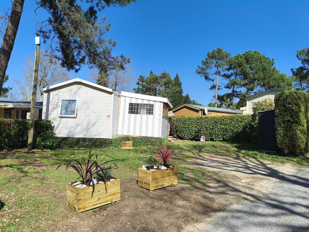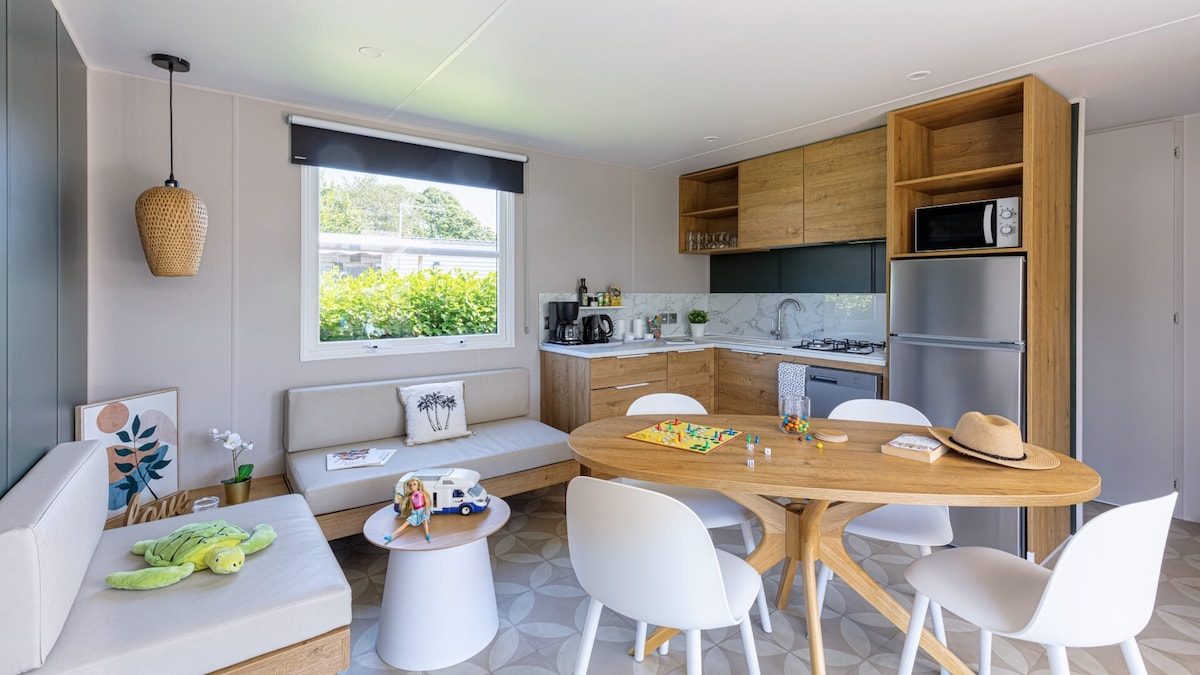 ✅ Tarif tout inclus ! Frais de ménage, draps et serviettes, lits faits, gel douche, café & thé le 1er jour, kit d'entretien, assistance 7/7. Super emplacement pour ce beau Mobile home tout neuf avec grande terrasse couverte et jardin clos situé à 200m de la plage et entouré de verdure. 2 chambres, salle de bain, douche italienne, cuisine équipée, séjour avec TV, grande terrasse couverte, jardin privatif clos, cabanon de jardin avec cuisine extérieure, barbecue, etc
