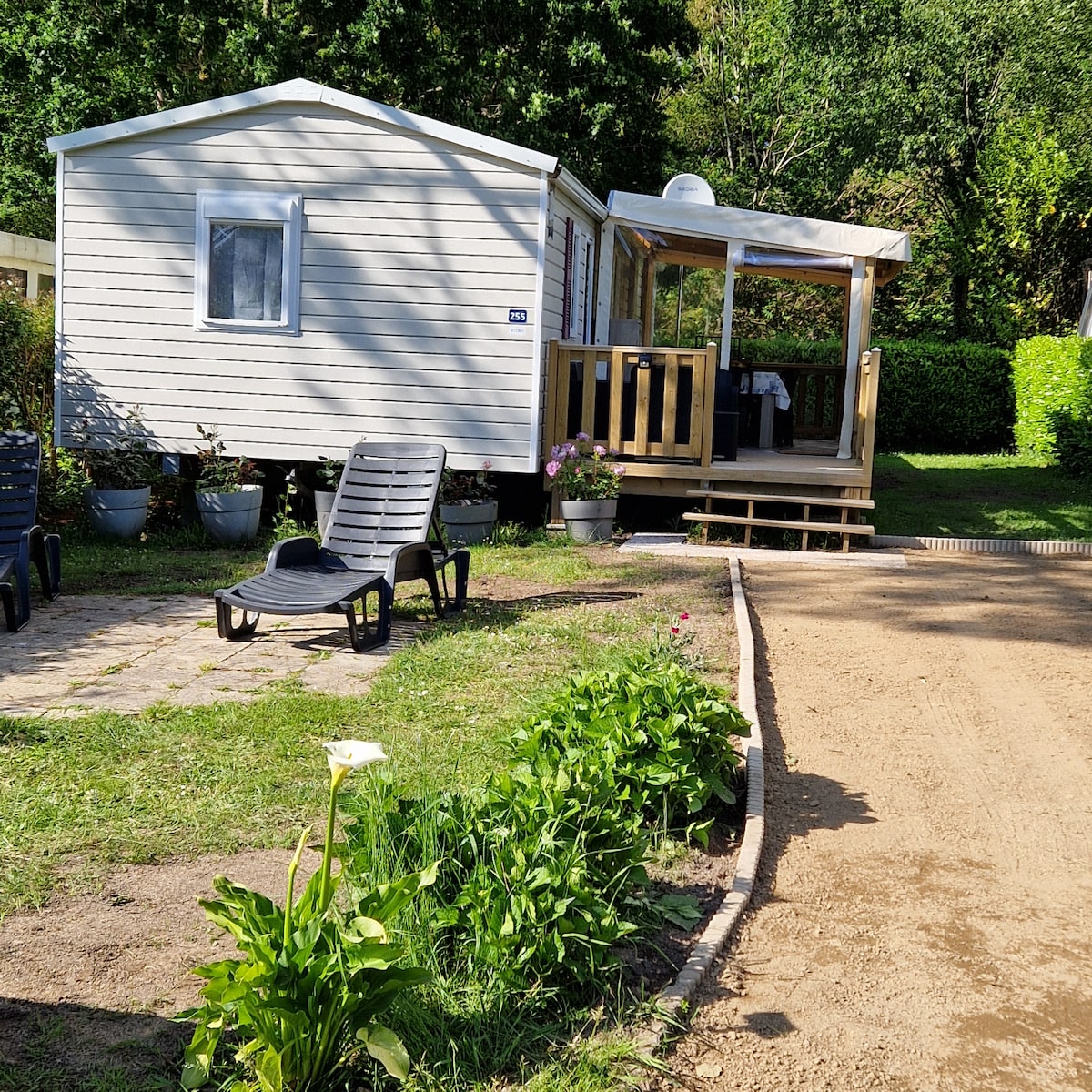 Très joli mobil-home au camping de Pontérec à 5 mn en voiture de la plage, sentiers côtiers en accès direct du camping. 37 m² : salon, salle à manger, cuisine équipée (frigo, four, micro-ondes, 4 feux gaz), 1ère chambre grand lit 160x200 + dressing, 2ème chambre avec 2 lits 70x190 pouvant être rapprochés + placard penderie, SDB avec grande douche, WC séparé , terrasse avec table, chaises et parasol. Commerces à proximité. Possibilité location linge. Possibilité forfait nettoyage