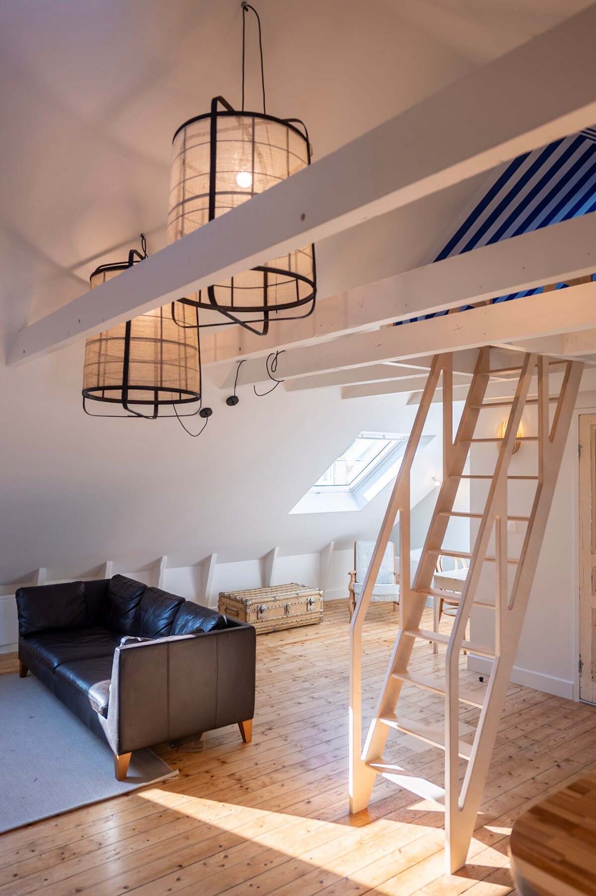 Au dernier étage d'une maison 1900 en coeur de ville, venez vous ressourcer dans cet ancien grenier aménagé en loft et profitez d'une fantastique vue mer sur la presqu'île de Kermorvan. La belle hauteur sous plafond et la double exposition rendent ce logement de 60m2 très lumineux et agréable. Une escale tout confort dans la belle cité de caractère du Conquet : cuisine toute équipée, linge et serviettes fournis, emplacement hyper centre, embarcadère pour les îles accessible à pied à 8 mins.