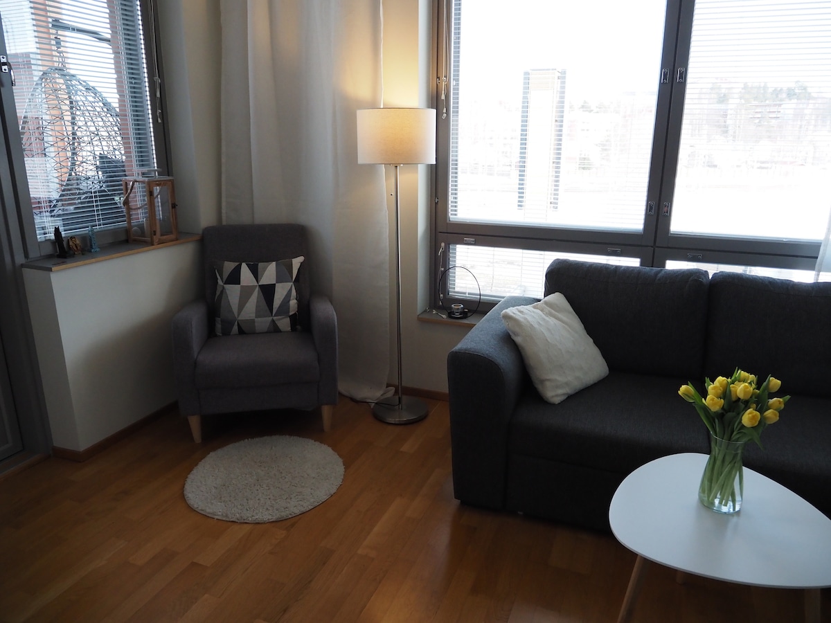 Cozy and stylish one-bedroom apartment with balcony in Oulunkylä, Helsinki. The apartment offers everything you need for a quick visit or a longer stay. Easy transport connections from the city center and the airport, about 10 minutes by train. Also excellent bus and tram connections, e.g. Viikki campus and Aalto University. The apartment was carefully renovated in 2024, all surfaces and furniture are new. Good jogging trails and one of the best pizza restaurants in Helsinki nearby.