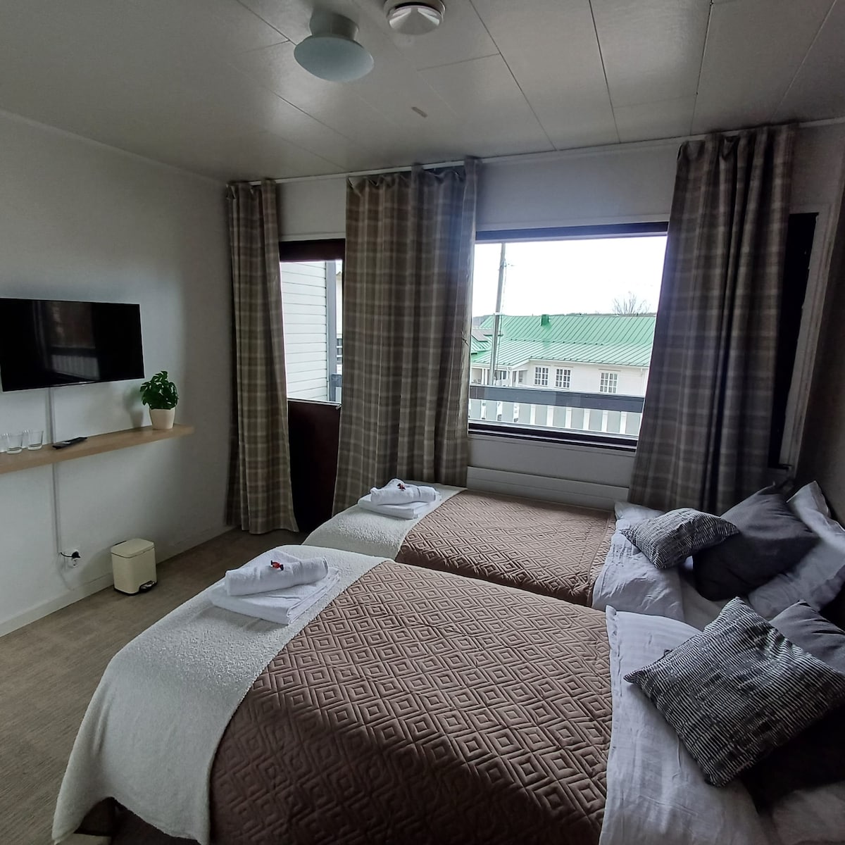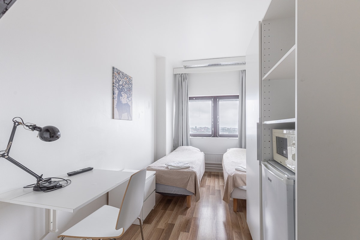 Winter offer free parking for hotel guests until end of March 2026. Homelike hotel room with great amenities at Hiisi Hotel Turku Seaport in Turku Harbour. The room featuring 2 single beds is suitable for up to 2 persons. Work desk and chair and an ensuite bathroom, a flat-screen tv and WiFi. All rooms feature a mini fridge. Linen, towels and final cleaning are included. No breakfast, reception or air-conditioning. Please note rooms are on the 2nd floor and the hotel has no elevator.