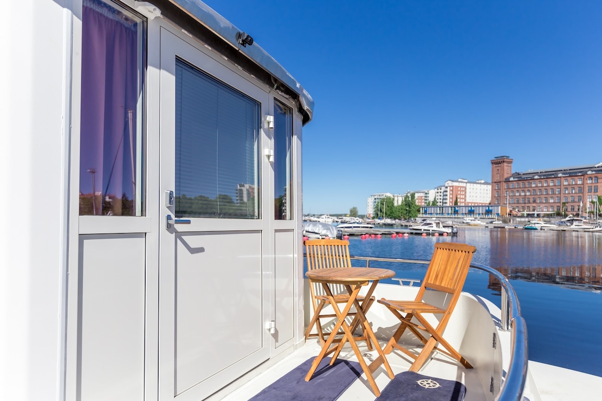 Have a special nice stay on the lakeside in a 2018 built houseboat just in front of the new Tampere only 1,5km from railway station. Enjoy the sunset after sauna on three teraces. This is a real 2 in 1 package: apartment and cottageholiday. From 1. May also the upper deck is in use. Please check availability before making reservation as the boat has been lifted up for service winter 2023/4.
