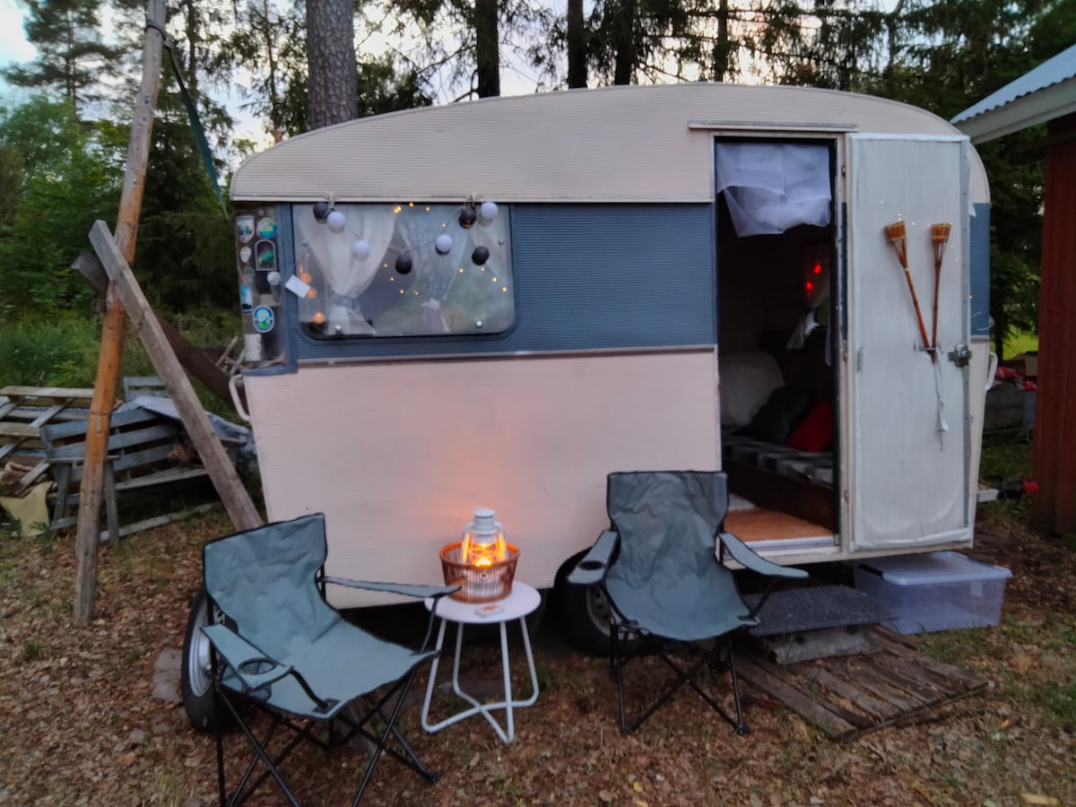 Eri sympaattinen, pieni, tunnelmallinen (ei remontoitu) antiikkivaunu. Parhaat unet ikinä, puhumattakaan fiiliksestä! Passeli pikku reissuihin muutamalle henkilölle ja lemmikille. Pienehkölle lemmikille peti pedattu ja ruokakuppi, ruokailualusta sekä pyyhe. Kysy, mitä ikinä tulee mieleen, selvitellään. Muista hymyillä kun vedät Serpolettea auton perässä, on harvinainen yksilö!