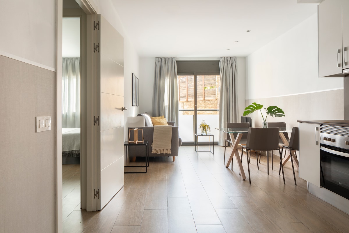Welcome to your stylish and familiar 125m² retreat. Designed for supreme comfort, this contemporary apartment truly feels like a home away from home. Floor-to-ceiling windows bathe the space in light and connect you to a lush, beautifully arranged patio. Located near Sants Main Train Station (Sants Estació), our strategic position ensures exceptional connectivity with direct, easy links to the airport and city centre. Enjoy effortless travel and an unforgettable family or business stay.