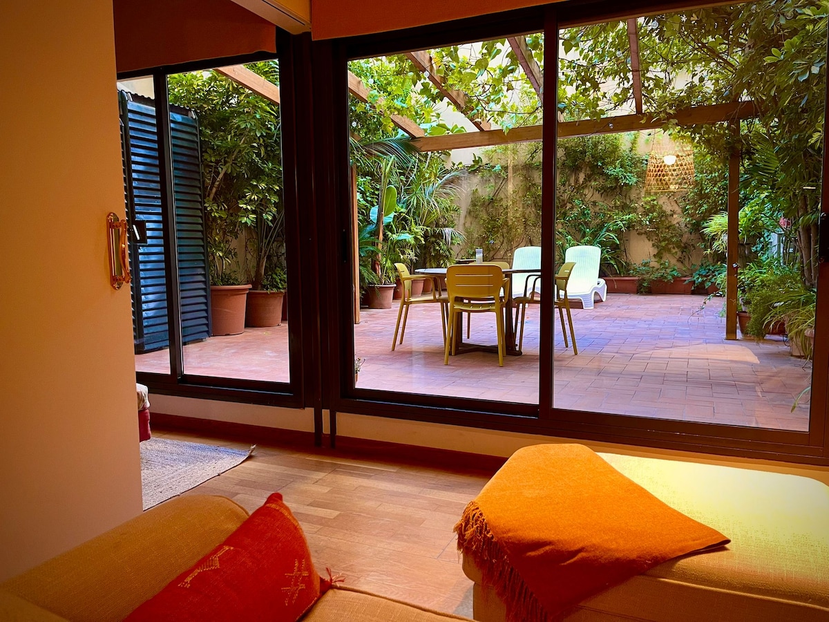 Wonderful duplex with terrace/garden located in the heart of Barcelona, in Raval neighbourhood. 2 double bedrooms, a bathroom and a toilette, dining room and separate living room with sofa bed, patio with dining table and deck chairs. Parking in the building (€15/night) Arrival time : From 3pm (flexibility to be confirmed) Check-out time: 11.00 am (flexibility to be confirmed) After 8pm: €25 supplement After 11pm: €35 supplement ESFCTU00000805600049938400000000000000000HUTB-0040196