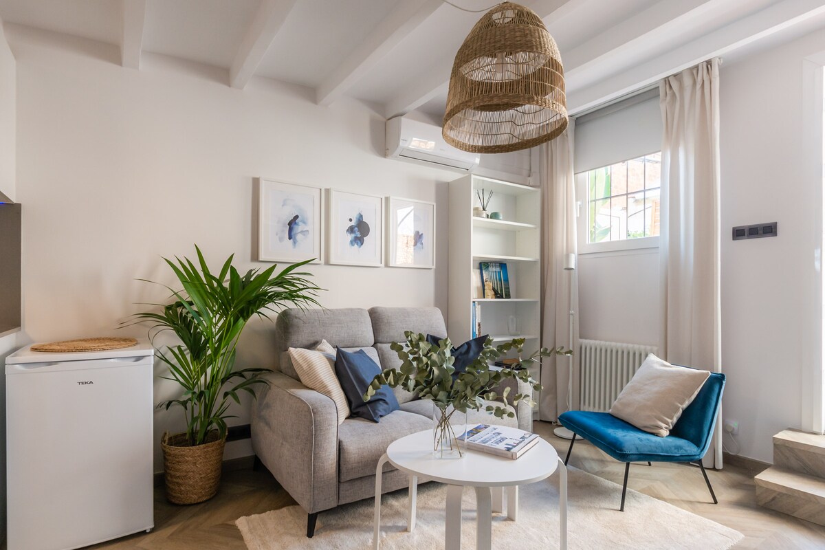 We, the Alma Team, have refurbished 6 unique apartments in a 19th century building, located off of Barcelona's most famous street: Las Ramblas. In our Airy Bohemian Studio, you will be immersed in the chill out ambiance of Ibiza, soaking up its soothing tones. Relax on the Acapulco chairs under the wicker pendant light with gorgeous hanging plants. Open up the balcony doors for a cozy dinner in the sunlight overlooking the street below. And you will not find a more centrally located flat!