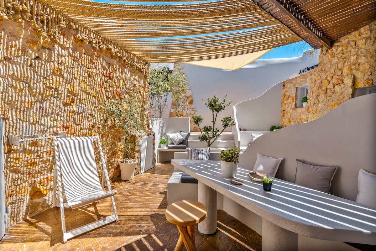 Welcome to our Hidden Gem in Fira Kontochori, blending traditional charm with modern comforts. Our cave house accommodates up to 6 guests, featuring a well-equipped kitchen, cozy bedroom, and a living room with additional sleeping options. The bathroom offers a harmonious blend of traditional aesthetics and modern fixtures. Outside, a spacious garden with wooden tables, a private jacuzzi, and Aegean Sea views await you.