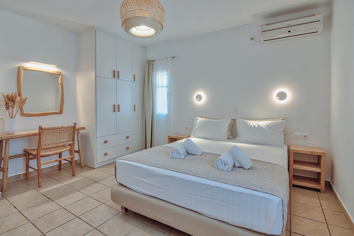 Located in Livadia, in the island of Paros, at a wind protected cove in 20m walking distance from a sandy beach. The total living space is 105 m2, it can accommodate comfortably up to 4 guests and is ideal for large groups or families. Surrounded by terrace, at an elevated position which offers sea view, walking distance from the beach and the center of Paroikia. Following the Cycladic tradition, the house has been painted white. Inside however, has decorated in minimal design.