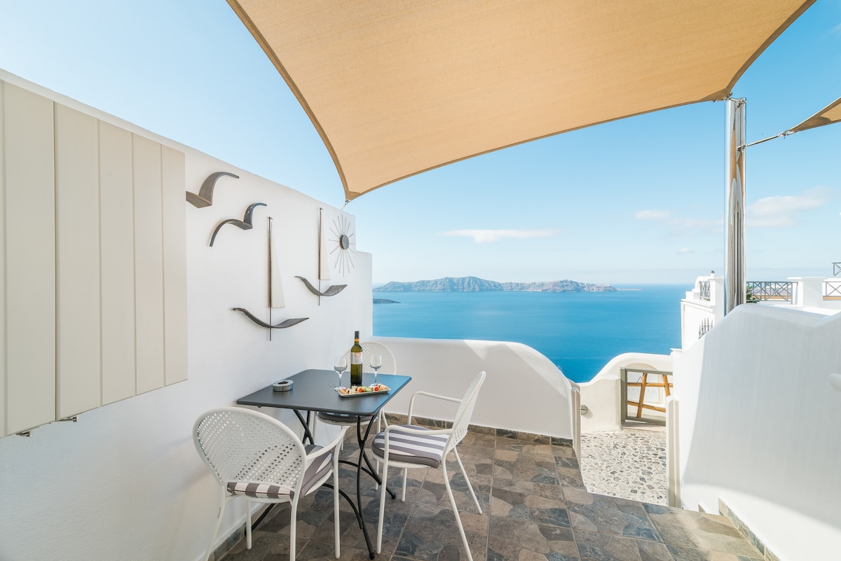 Mirabo Villa’s Junior Suite (maisonette style) has one of the most beautiful balconies in the neighbourhood of Firostefani. Junior Suite is ideal for couples who want privacy and relaxation for their days in Santorini in a two floor apartment, with a bedroom with double bed, a WC with shower and a private balcony with an amazing view at the caldera in the upper floor and a bathroom with a living room in the ground floor. There is access to a Shared Outdoor Plunge Pool (Not Hot) up to 2 guests