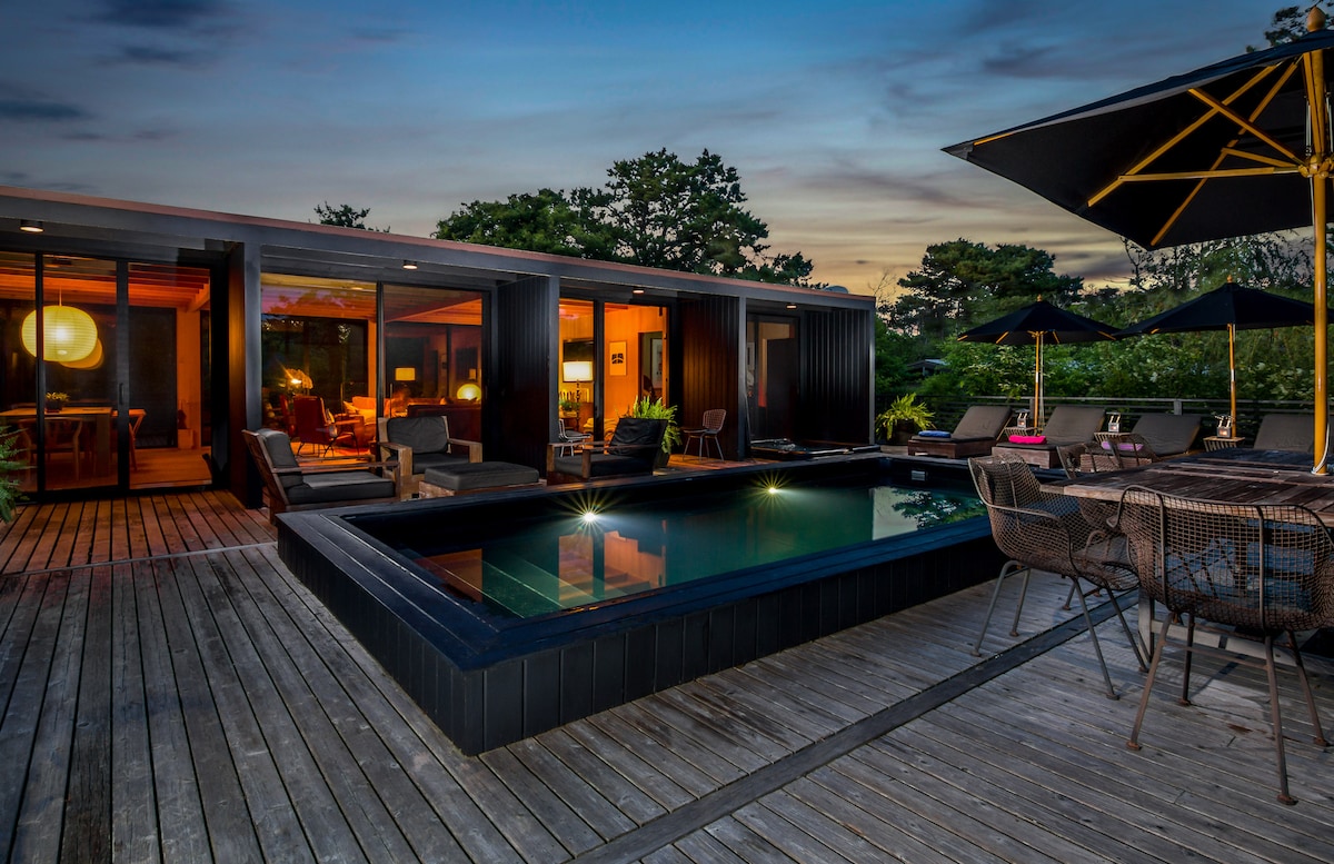 This Fire Island Pines house is an Early-Pines artist's paradise. Our house was once written up in House & Garden (photo spread at house), and provides an authentic bohemian Pines lifestyle: Layered decks descend the hill for sun and shade with main decks surrounding, plus a roof-top deck for 4, all make for a party-friendly space; secluded on two old-growth lots for plenty of get-away privacy. Beautiful white-sand beach only 150 steps away. You'll fall in love with this unique Pines experience.