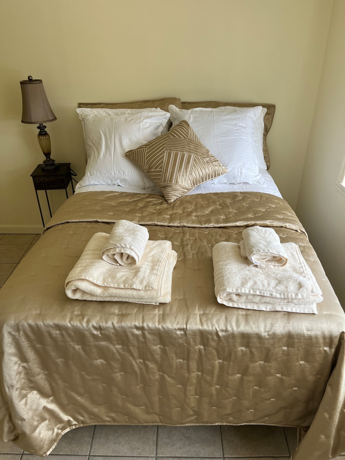 Private one-bedroom suite in Jericho featuring a queen bed, spa-style jacuzzi soaking tub, and an electric heater fireplace that warms the entire unit. Enjoy a separate private entrance for comfort and privacy. The space is designed for relaxation, with plush towels, premium toiletries, and a clean, modern feel. The fireplace is the primary heating system and is fully adjustable using the remote control. Perfect business travel, or a relaxing reset.
