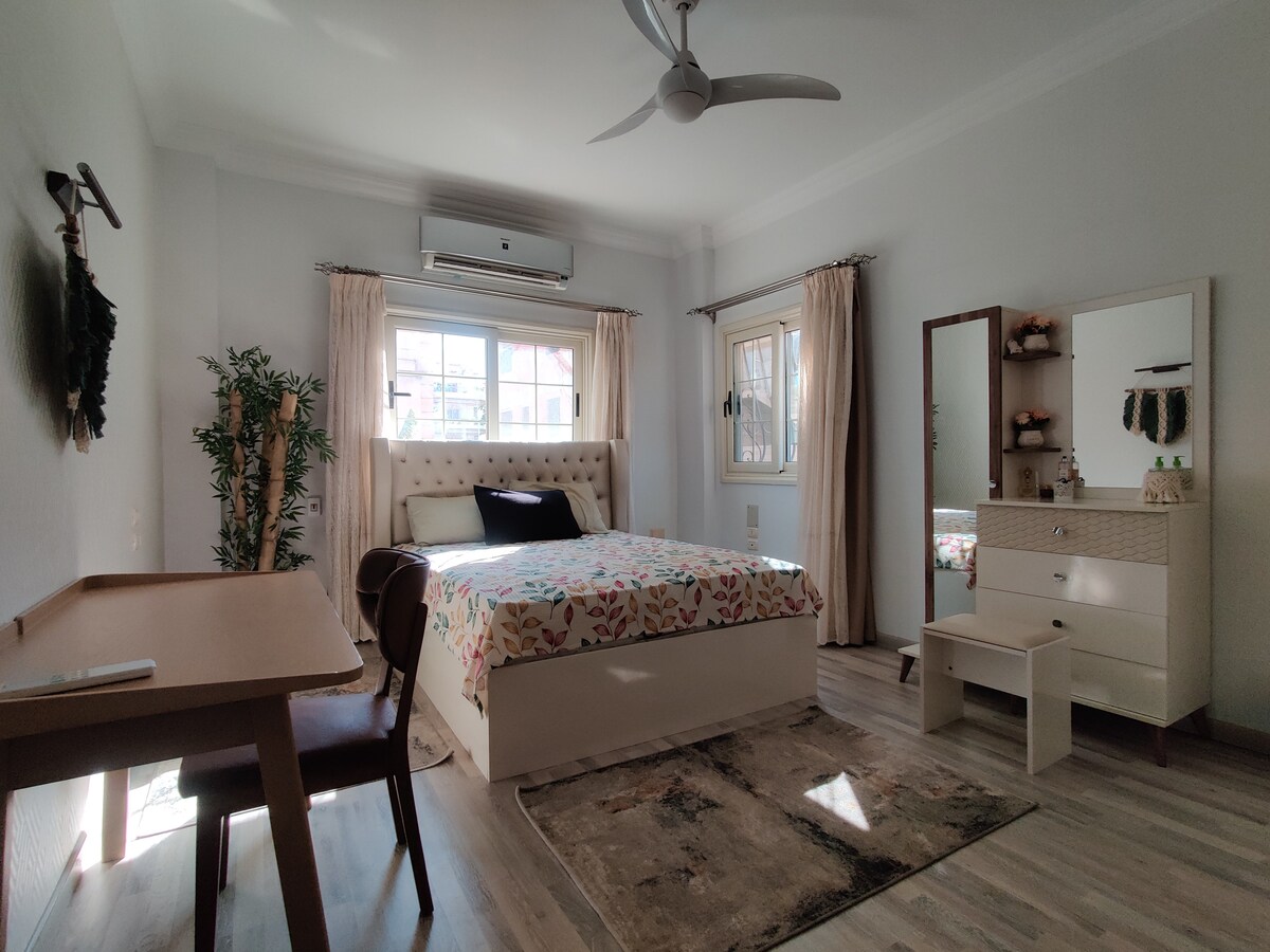 "Double the Comfort, pleasure : Your Dream Double Bedroom Awaits! ,create Memories for a Lifetime!" Here is a description of our studio : 2 beds. WIFI Air conditioning mini-fridge. coffee corner LED TV. Toiletries private bathroom Microwave An exceptional location: 10 minutes to (Arkan Mall & Mall of Egypt & Mall of Arabia) 5 minutes to (el mehwar rd & El Wahat rd ) 20 min to The Grand Egyptian Museum 30 minute to Pyramids of Giza The studio is directly in front of the mosque