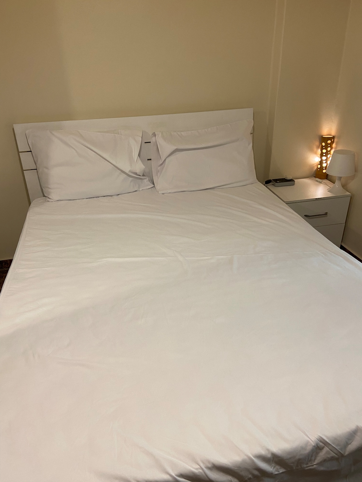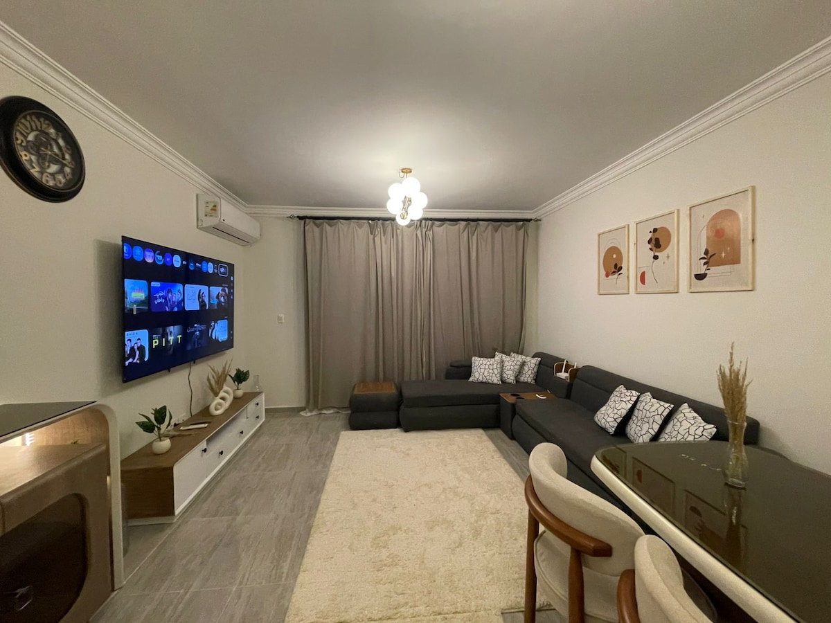 apartment is located in the quiet Jannah Zayed 2 Compound in the heart of Sheikh Zayed. With an open view and modern furniture, it’s perfect short-long term stays. 🌟 The Space: Spacious 130 sqm apartment – open view. •2 bedrooms: 1 master bedroom with a king-size bed + 1 bedroom with two single beds. •Cozy living room. •3 air conditioners (bedrooms + living room). •2 bathrooms with 2 gas water heaters. •Fully equipped kitchen with microwave. • High-speed WiFi to stay