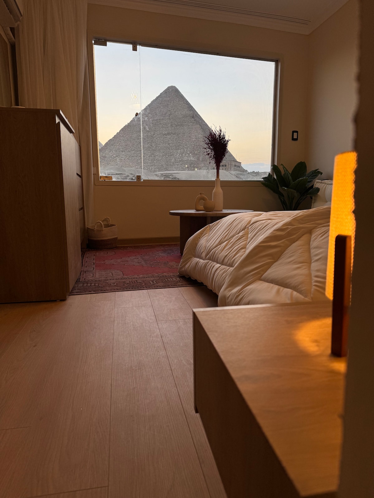 Enjoy a warm, family-friendly stay in this inviting 3-bedroom apartment located inside the prestigious City View gated community—just minutes from the Pyramids and the Grand Egyptian Museum (GEM). Overlooking landscaped gardens and calming water features, the apartment offers a peaceful retreat from the city.