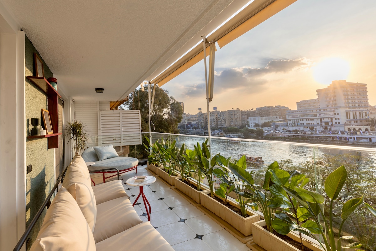 City Skyline Views: Charming, Cozy 1 bedroom 1 bathroom apartment in Agouza. Close to Tahrir Square, Egyptian Museum, Zamalek neighborhood and walking distance to British Council. Beautiful Terrace. It is fully equipped with all you might need, freshly renovated.