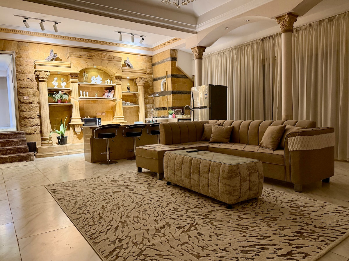 Spacious 2 bedrooms apartment featuring first row stunning view of the pyramids. With the easiest accessibility for a pyramid view property, directly located by the main road, and right beside the new Grand Egyptian Museum. This newly furnished sunny apartment is exactly what you need for an unforgettable stay during your trip in Egypt.