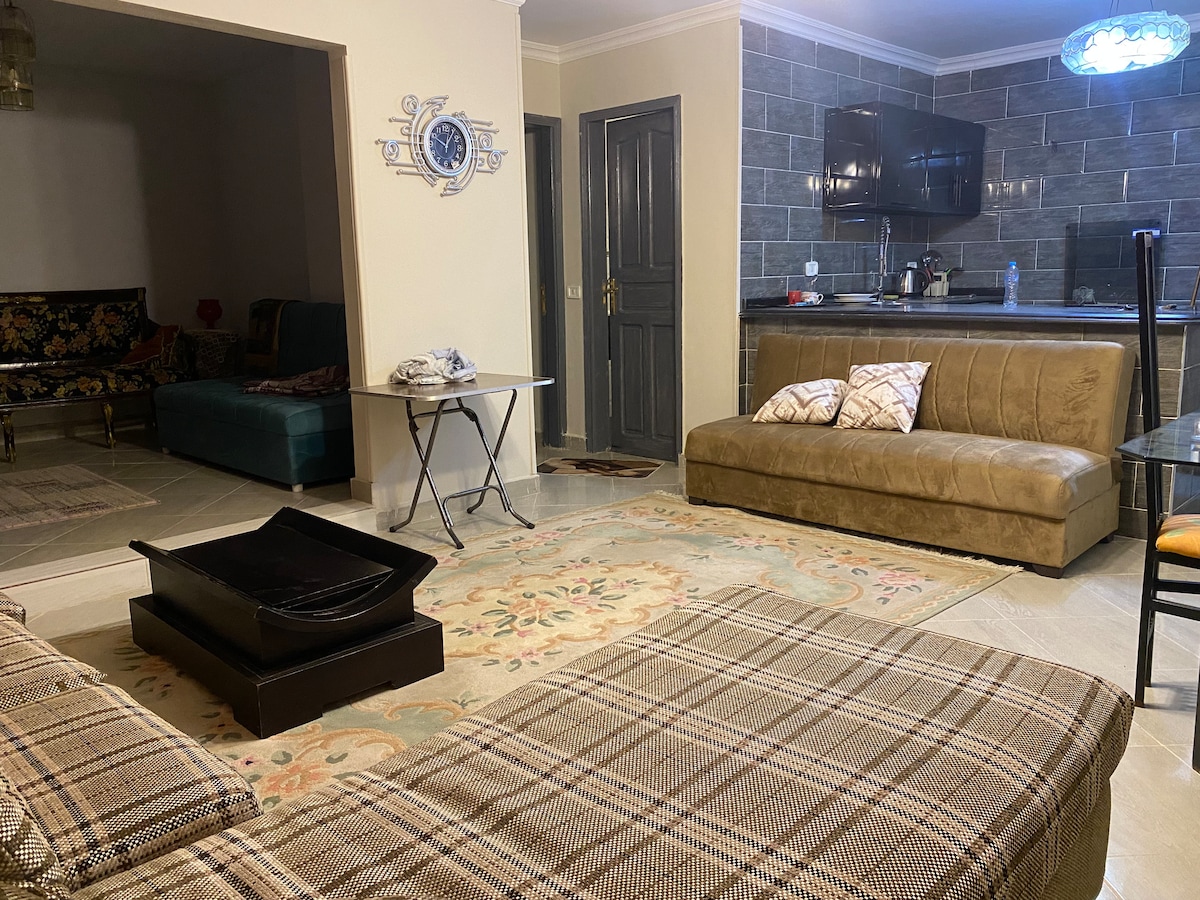 An economy option yet cozy, stylish and hygienic. A furnished apartment in Sheikh Zayed city, Egypt where there are no crowds and quality services are available everywhere. The apartment is located in a medium class local residential building only 30 minutes away from Giza Pyramids, the Egyptian Museum and other monuments. It's also surrounded by a lot of marketplaces, shopping malls and close to everything you need.