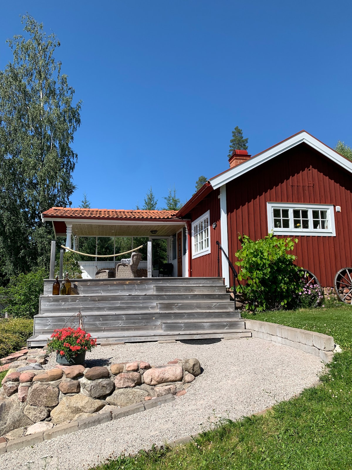 2 vuxna och 1 barn. Fräsch och mysig stuga. Dusch och toalett finns i stugan. Ett stort rum med kök. Stor altan. Fantastisk utsikt över Orsa sjön, bergen, åkrar och ängar. Vår underbara trädgård med äppelträd, hallon, blommor mm mm. Här kan man vila och ladda sina batterier. Det är ca 3 km till Orsa centrum . Rikt fågelliv. 20 min.till Grönklitt. Orsasjön med långfärdsskridskor och skidspår. 15 km till Mora och Vasaloppet.