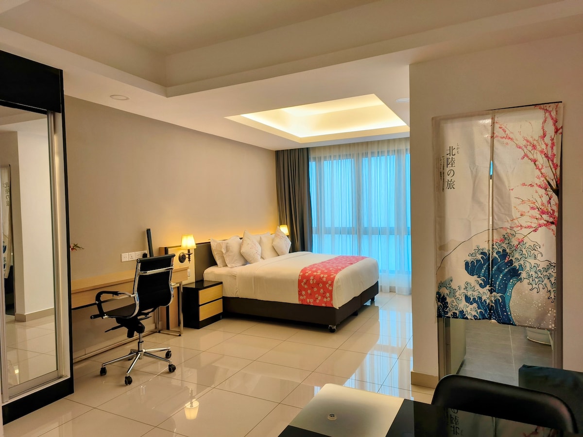 This HomeStudio is located at Tower 4, Grand Ion Delemen, Jalan Ion Delemen, 69000 Genting Highlands, Pahang, Malaysia. It is at the peak of Genting Highlands and situated 6,000 feet above sea level. Guests could enjoy the invigorating cold breeze and pleasant 17°C weather, featuring coxy and autumnal sensation with flying maple leaves and earthy hues. The unit is designed for families and friends, providing comfortable stay amidst breathtaking surroundings.