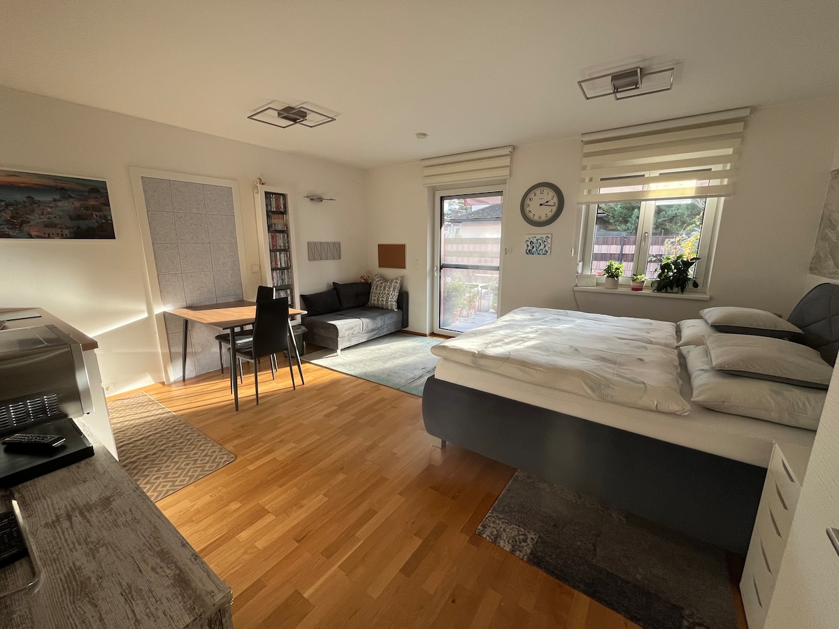 Helle 2 Zimmer Wohnung mit guter Verkehrsanbindung ( 15 Min.) zum Zentrum. Vermietet wird eine Wohnküche mit den nötigen Geräten und Utensilien zur Selbstversorgung. Das Schlafzimmer befindet sich hofseitig mit Ausgang zur Terrasse, wo Sitzmöglichkeiten zum Verweilen einladen. Helles Badezimmer mit Dusche, separates WC. Laden des Elektrofahrzeugs gegen Gebühr an der Wallbox möglich.