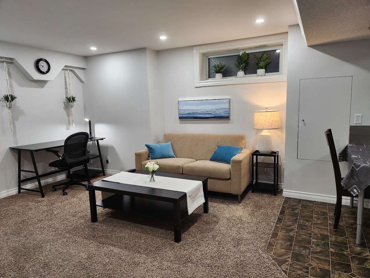 - Stay at a new, clean, comfortable suite at the main/ground floor of a bi-level house. - The suite has 2 spacious and bright bedrooms with 1 King and 1 Queen beds and large windows. - Loads of amenities include everything that you need to stay away. - Brand new from beds/mattresses, comforters, blankets, pillows, sofa, kitchen, stainless steal appliances, patio set - Enjoy outside green view through large windows & patio set, and nearby park. - A scenic walking/bike trail in the backyard.