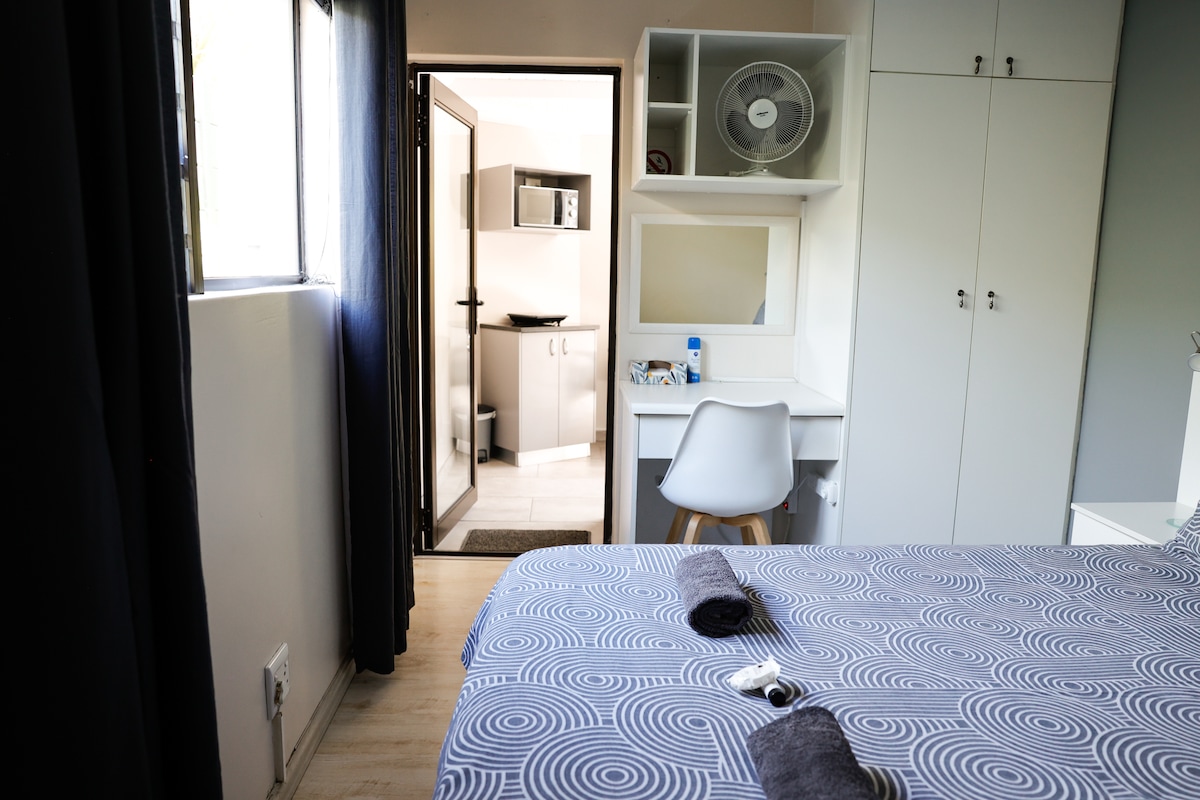 Unwind on the poolside loungers after a busy day exploring and enjoy the view of Table Mountain. This spacious modern studio looks out onto your own exclusive use luxurious private pool patio. Go for a morning stroll along the beach, just 100 meters away. Use the study desk area indoors, or the large poolside table outside on the sheltered patio to work remotely with our high speed Fiber. The studio has backup lighting, air conditioning, Netflix and your own gated parking bay.