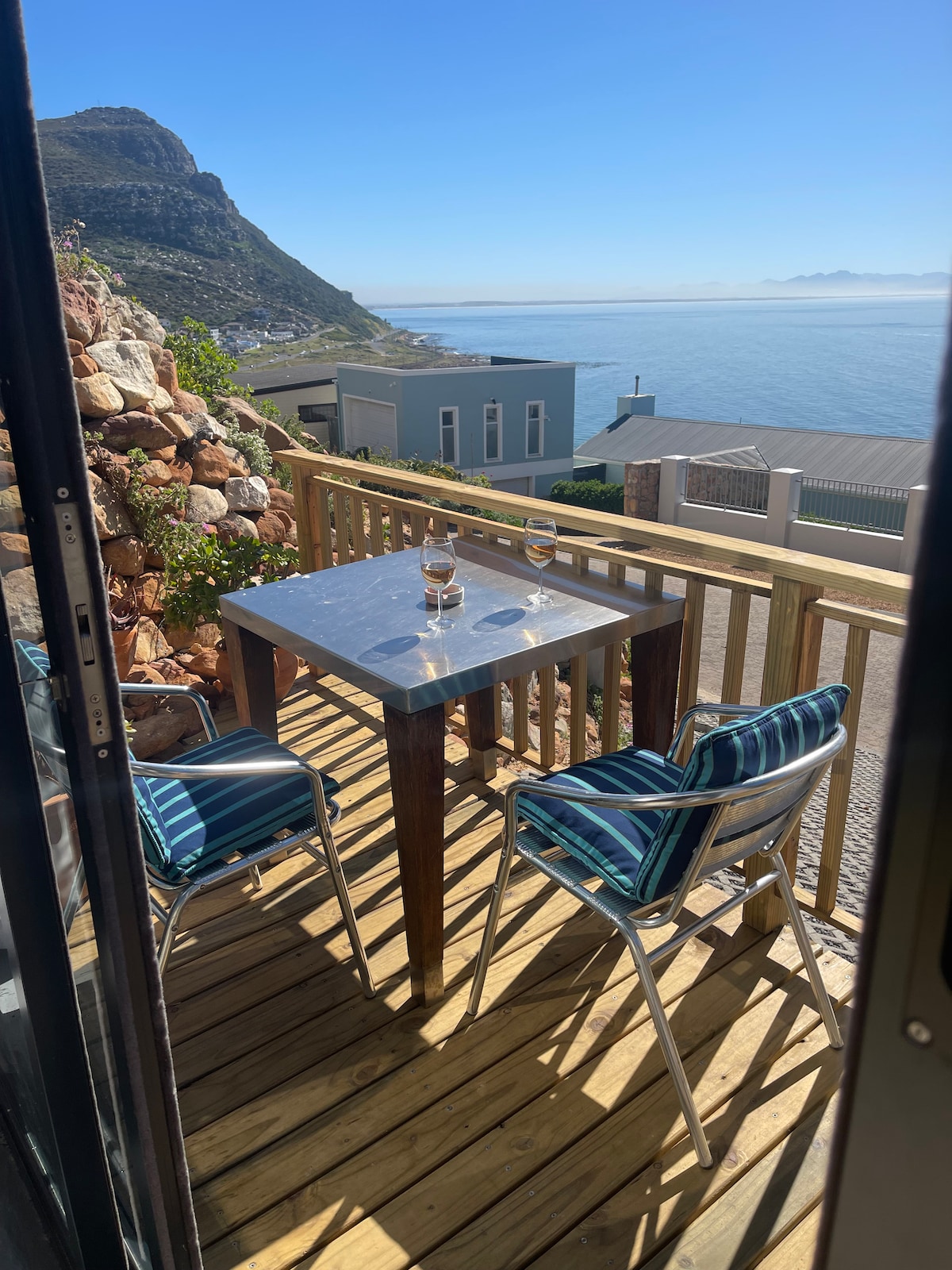 Nestled in the exclusive area of Cairnside, this semi-detached house offers the perfect place to enjoy beautiful views of False Bay and is less than 5 mins from the local beach and tidal pool. One of our favourite past times is watching the water activities from the sheltered deck. Whale spotting, kite surfers jumping in the bay, sailing regattas and flocks of birds migrating along the coast. The sun rises across this side of the bay, if you're up early you'll be mesmerised by the view.
