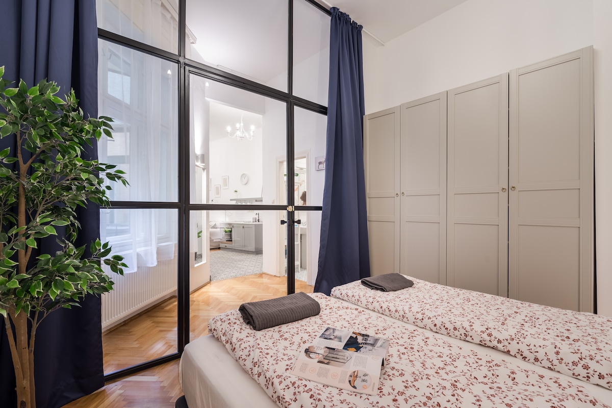 Spacious and breezy 82 square meter apartment in the heart of Budapest downtown, on the 2nd floor, with elevator, of a building dating back to the early 20th century. Located in a charming neighbourhood within the 5th district. This impressive and luxurious property is the perfect stay for an unforgettable holiday. Thoughtfully designed with a close attention to the smallest details, everything serves your comfort and relaxation. Be a local with Hiraeth home.