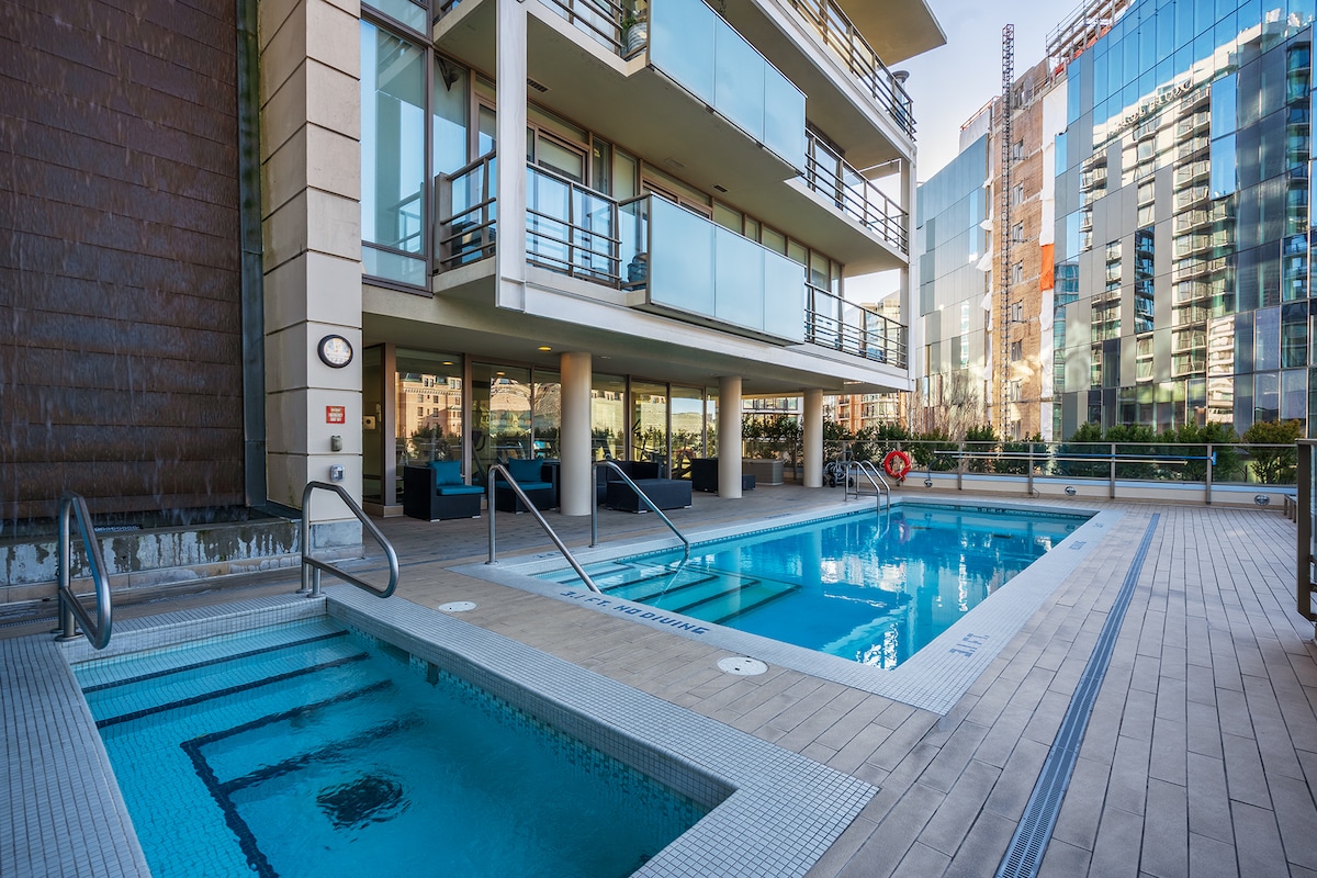 This is for a booking at the Victoria Waterfalls Hotel. Enjoy stunning Inner Harbour views from this 15th floor modern & spacious corner suite in downtown Victoria w/ FREE secure parking. Just steps away from the iconic Empress Hotel, Inner Harbour & Parliament buildings. The suite boasts a chef's kitchen, floor to ceiling windows, open plan living & dining area & a generous King bedroom w/ ensuite. Relax on the wrap-around balcony or enjoy building amenities like the gym, pool, & hot tub.
