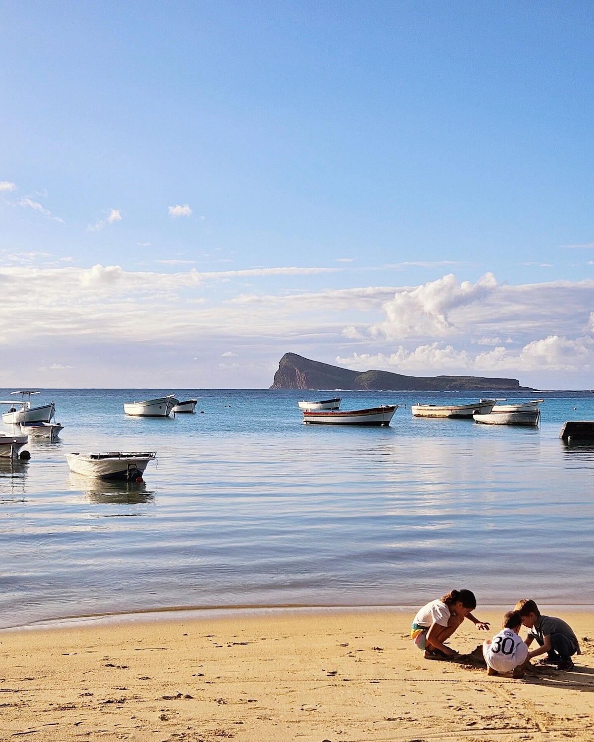 Our beach house sleeps 8 in 4 double bedrooms ( one ground floor ) plus a cot. RIGHT ON a beautiful safe long stretch of white sand, in the most desirable region of Mauritius, near restaurants & bars. Option of hot home cooked food delivered, nanny, therapist & driver all at low local rates. Enclosed private beach front garden, two outdoor dining areas, private parking in secure beachfront low level two story development. One of 26 privately owned units sharing large serviced pool and garden.