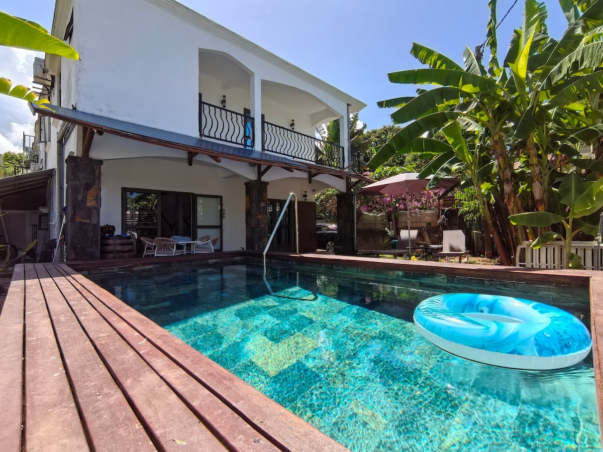 The house for tourists only is next to bras d'eau nature park with trekking paths among endemic trees and walking distance to the public beach.(EAST of Mauritius) Fully equipped and furnished. Three bedrooms with one ensuite, three bathrooms and toilets, balcony upstairs and terrace and garden downstairs. Two restaurants are nearby, sunshine fusion and seabell. Driving distance to supermarkets and town centre with a big local market. Rent a car or call a taxi. Buses pass by on schedule.