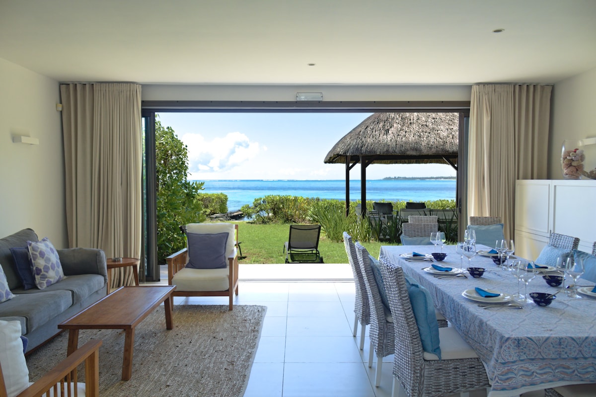 Our beach house sleeps 8 in 4 double bedrooms ( one ground floor ) plus a cot. RIGHT ON a beautiful safe long stretch of white sand, in the most desirable region of Mauritius, near restaurants & bars. Option of hot home cooked food delivered, nanny, therapist & driver all at low local rates. Enclosed private beach front garden, two outdoor dining areas, private parking in secure beachfront low level two story development. One of 26 privately owned units sharing large serviced pool and garden.