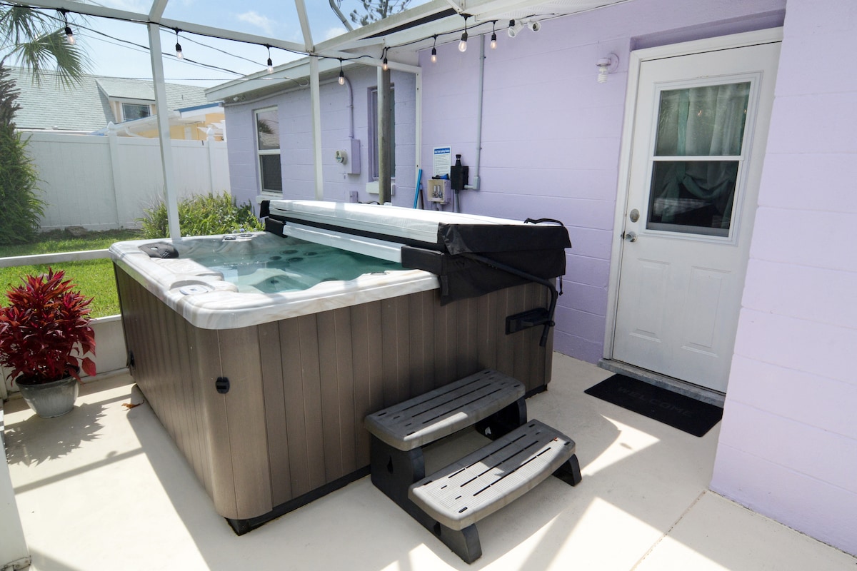 Adorable little 2 Bedroom 1 bath, bungalow with HOT TUB just steps from the beach. Respectful guests & dogs are invited to come & make this your home away from home. It is pet friendly(50 per pet fee per stay) The home makes you feel like you are in old tropical Florida, very airy & comfortable. High-speed wifi! GREAT MONTHLY DISCOUNTS!! BTW- the Gecko (3/2 with pool), Turtle 2/1 ( 3 houses from the ocean , Flamingo and Dolphin ( 2/1's with pools) are close by- All are pet friendly as well.