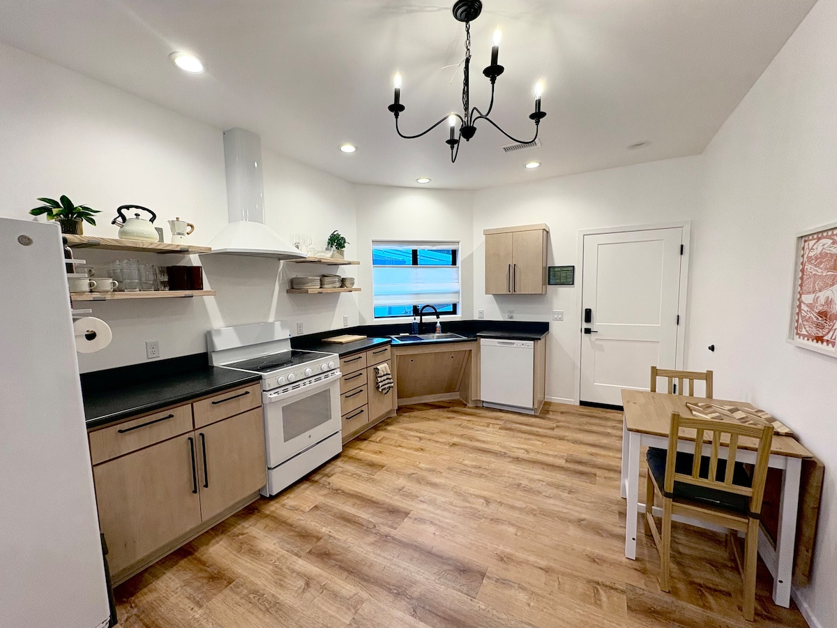 As 4th generation natives of Flagstaff, we are proud to offer this space. New construction with a modern but comfortable feel. Brand new HOT-TUB! Full kitchen which includes:stove/oven, refrigerator (with ice maker), microwave, dishwasher, pots & pans, dishes, silverware, blender & toaster. Coffee & tea provided. Washer & dryer in unit. One Bedroom with a king size bed and closet space. One full bathroom. Sofa bed in the living room area for extra guests. Just a note, we do not allow pets