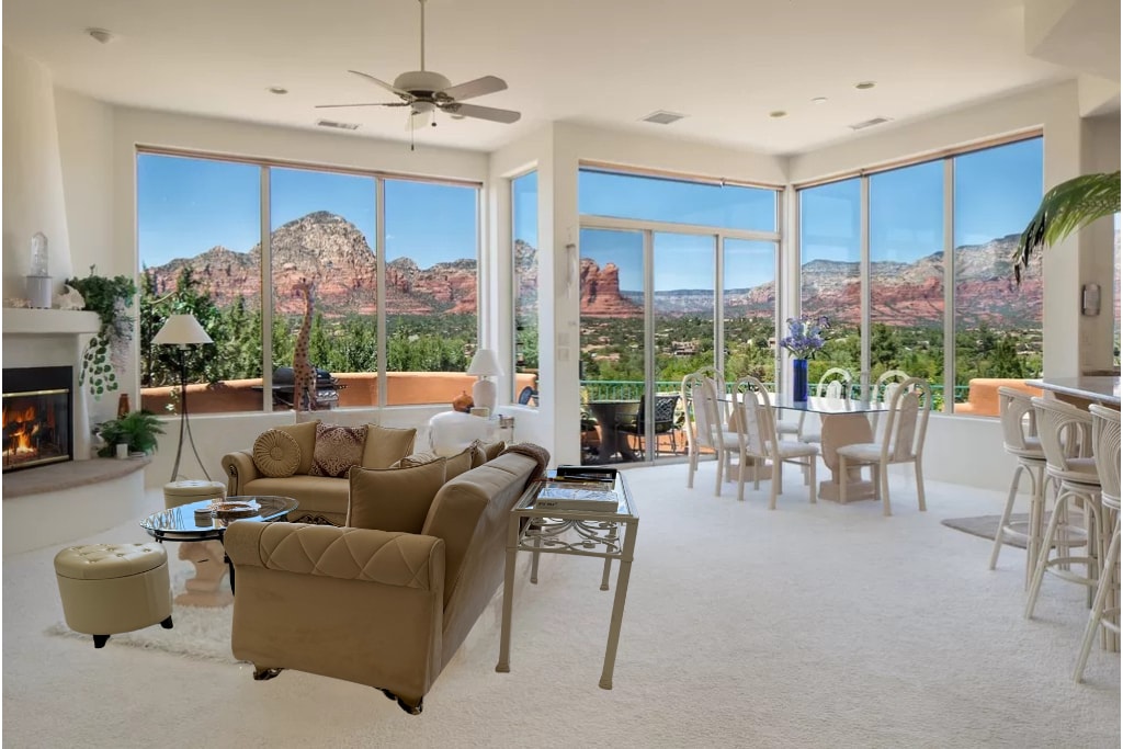 Enjoy majestic views of famous Sedona Red Rocks in the luxury of your own private villa. Steps away from iconic Chapel of the Holy Cross, popular hiking trails. House features mid-century modern aesthetic, 1- KING size , 1 -Sofa bed with 2 baths, 2 spacious living rooms, kitchen, office, outdoor dining space w BBQ. After a day in the desert, just short distance away, head to Downtown Sedona, pursue incredible art galleries and explore local restaurants ! TPT# 21426328/ 1,800 Sq. Ft.