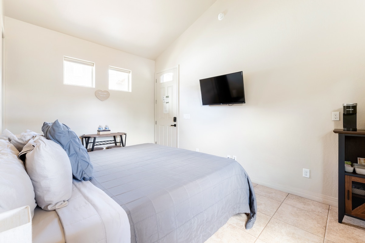 Functional centrally-located space. Dedicated driveway & path to a private entrance. Small patio space, king bed, table, kitchenette, & bathroom with shower. Note: there is no dedicated bathroom sink. The shower is large and has a mirror, and there is a kitchen sink area with small mirror as well. On the road to the Grand Canyon & Arizona Snowbowl. Walk across the street to Fratelli Pizza & Flagstaff Market Station. On the Flagstaff Urban Trail System (FUTS) for easy access to downtown.