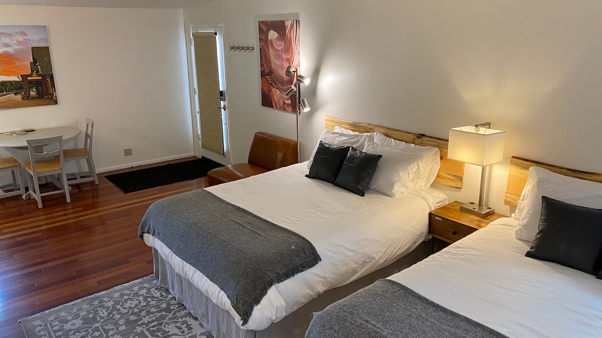 Studio Apt. Modern. Thoughtful Design. Super-comfortable & clean. European comforts, beds & bedding, & latest technology in a quiet neighborhood. 50"TV with Streaming, Super fast Internet & Ethernet. Kitchenette with microwave, toaster & a Keurig. Bathroom with Rain & Hand-held showers, Bidet. Fun lighting installation in shower. In a good, quiet tree-lined neighborhood, walk 2 blocks to Downtown. A great home-base for Grand Canyon & Sedona day tripping!