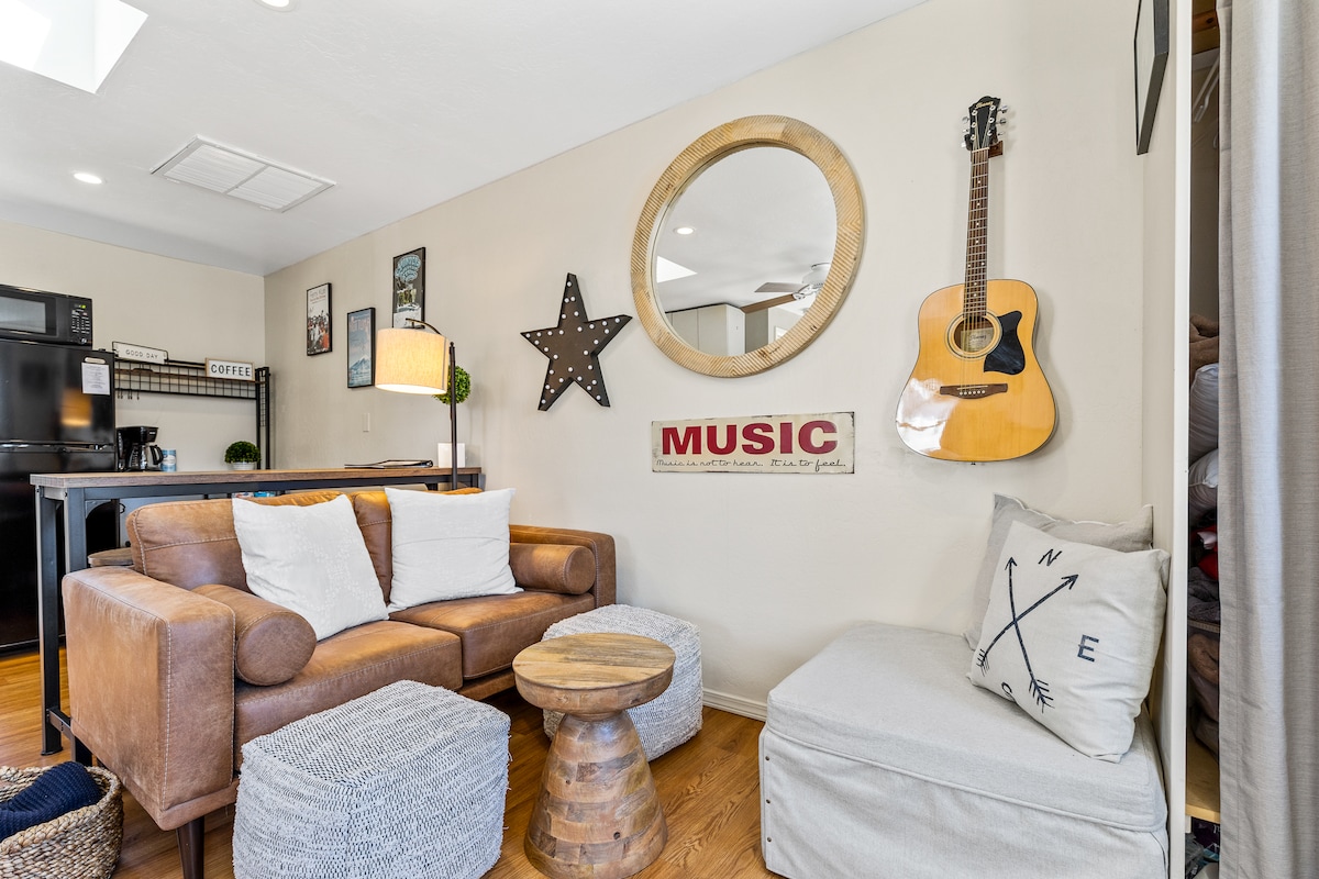 With Music on the Mind - this remodeled free-standing cozy studio welcomes you to share in our love, our music. *3 Blocks from Downtown! *Perfect for couples or solo travelers, this quiet space gives you the convenience of a 5-star location in a comfortable well curated private space. Walk 5-10 minutes to local eateries – comfort food, high end dining, coffee shops, grocery store -- it’s all minutes from your doorstep. New queen bed and 1 small sleeper ottoman(for kids),full bath and kitchen.