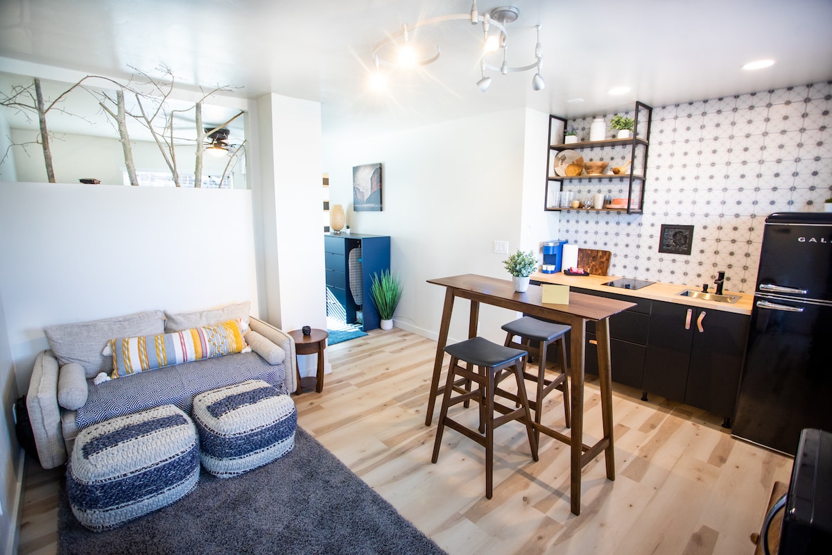 Studio Apt. Modern. Thoughtful Design. Super-comfortable & clean. European comforts, beds & bedding, & latest technology in a quiet neighborhood. 50"TV with Streaming, Super fast Internet & Ethernet. Kitchenette with microwave, toaster & a Keurig. Bathroom with Rain & Hand-held showers, Bidet. Fun lighting installation in shower. In a good, quiet tree-lined neighborhood, walk 2 blocks to Downtown. A great home-base for Grand Canyon & Sedona day tripping!