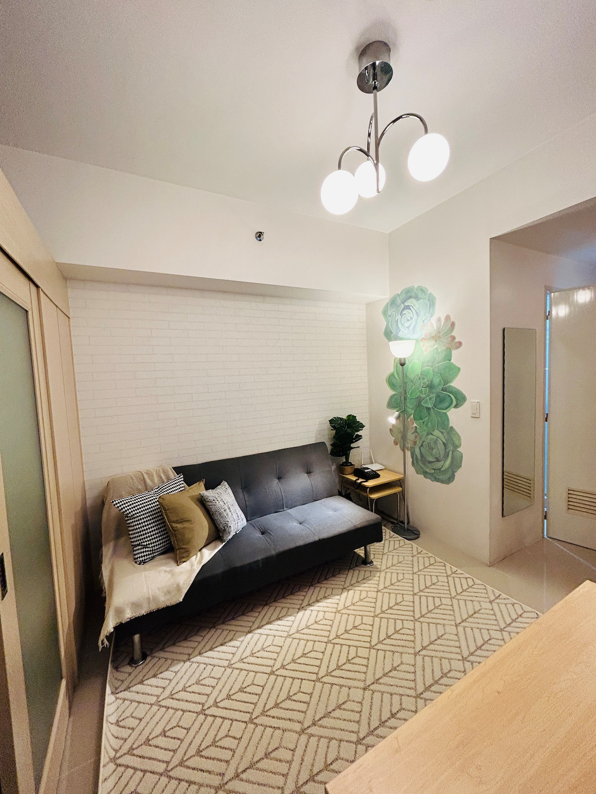 Escape to this charming succulent-themed one bedroom unit perched high in SM Light Residences Tower 1. Enjoy the convenience of mall access, blackout blinds for restful sleep, and a captivating view of the pool amenities. Whether you are working or exploring, you will enjoy the high-speed internet and landline, Smart TV (pre-loaded w/ Netflix and Disney+ subscriptions), and kitchenette, while being just moments away from the central business district. Your cozy retreat awaits!