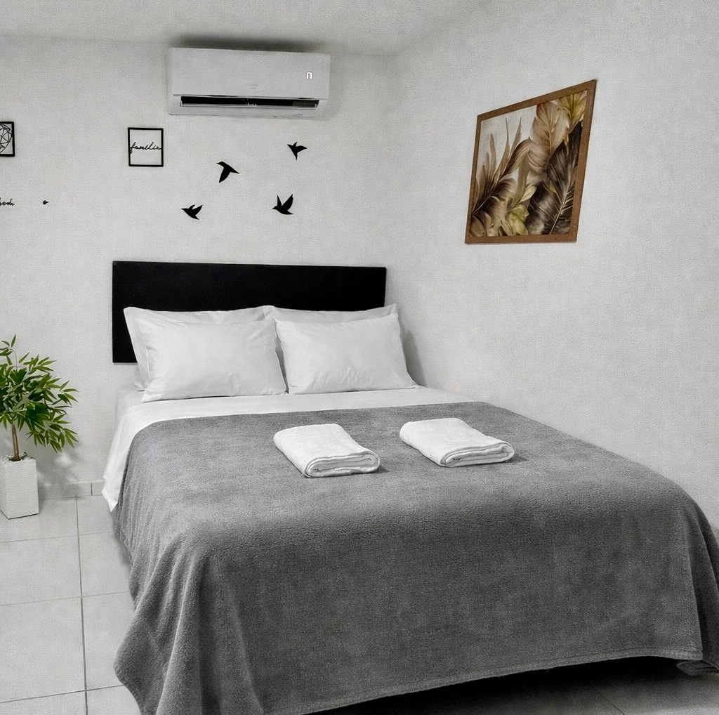 Village type house in a gated community with green spaces, fully equipped kitchen. Two bedrooms with air conditioning, two double beds with D33 orthopedic mattress and comfortable pillow top. Two sofas bed in the living room with fan. White bed and bath linens 100% cotton 180 threads, sanitized after each guest. Portable barbecue, table and shower in the back. Close to restaurants, delis, pharmacies and supermarkets.