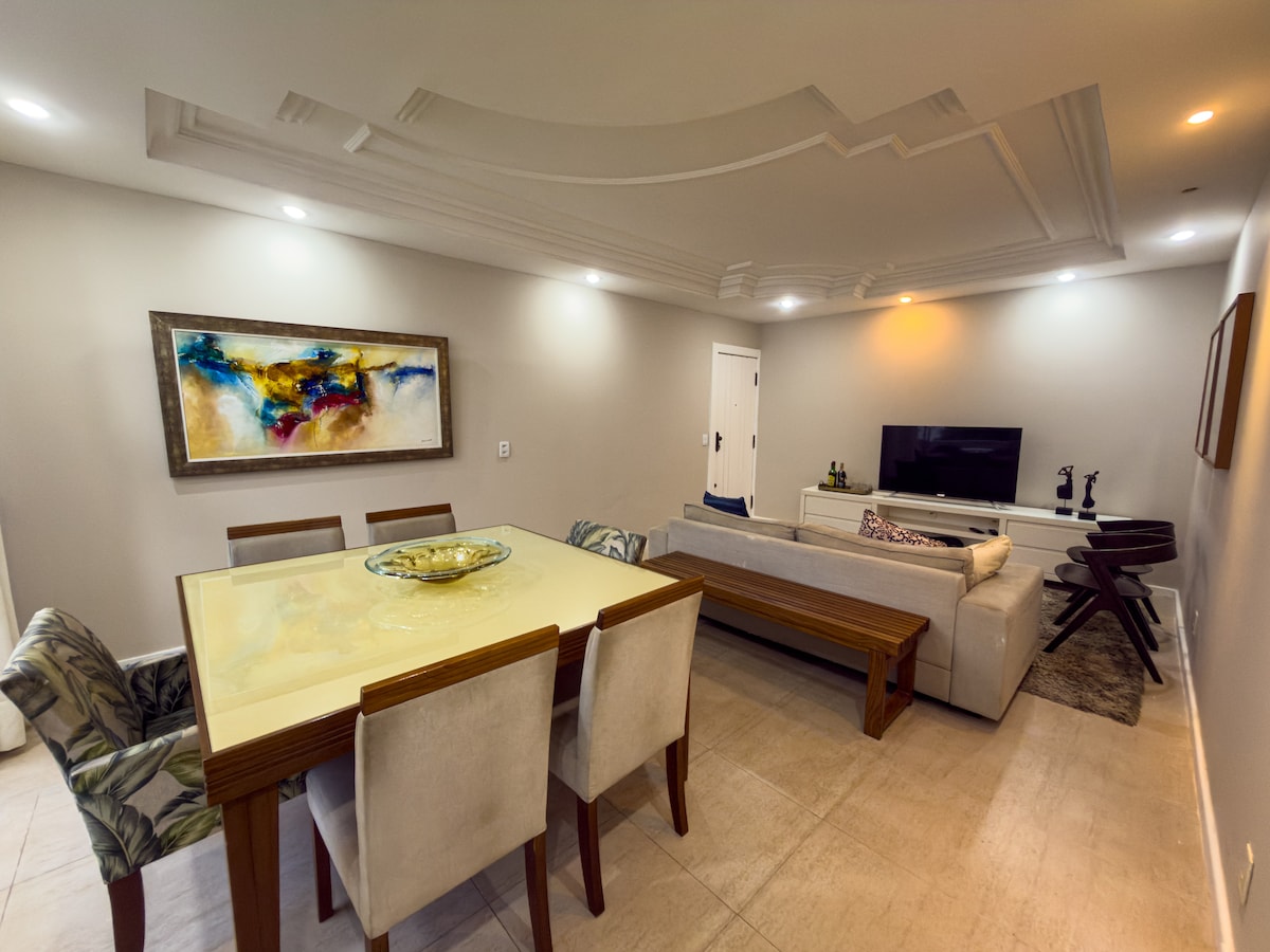 Apartamento térreo, 100 m da praia com 2 dormitórios, sendo um suíte com varanda, 2 banheiros , sala de estar, jantar, cozinha americana, área de serviço, quintal onde a brisa do mar transforma a sua área Gourmet em um espaço único. Totalmente mobiliado, bem decorado e climatizado, com garagem para 1 carro. O imóvel acomoda com elegância e conforto 4 pessoas. Boa localização, acesso fácil, ambiente excelente para suas féria em família e trabalho remoto.