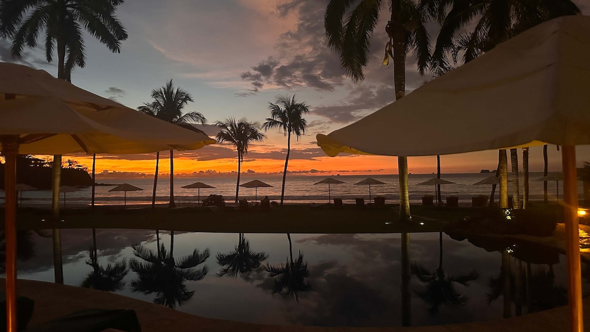 Make the most of your Costa Rica vacation by staying in this beachfront condo located in Surfside, Playa Potrero. Enjoy your morning coffee watching pelicans dive into the ocean bay. Watch gorgeous sunsets nightly from your own private terrace. It has an open layout, a spacious beachfront terrace, a full kitchen and a large primary bedroom with king sized bed. The second bedroom is set as an office with a pullout sofa bed.
