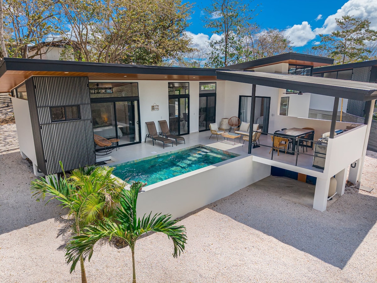 Nouvellement rénovée. Séjournez dans une superbe villa avec piscine à débordement privée, située dans une communauté sécurisée, proche des plus belles plages du Costa Rica. Entièrement rénovée en 2025, elle offre confort moderne et vue imprenable. • 2 chambres climatisées avec salles de bain privées • Espace ouvert avec cuisine équipée et salon cosy • Salle à manger extérieure pour admirer des couchers de soleil spectaculaires • Wi-Fi, alarme et parking clôturé